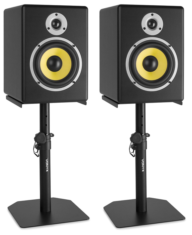 Soporte ajustable para monitor de estudio de hasta 8 pulgadas. Los soportes se ajustan en altura de 34cm hasta 49cm. Incluye 8 capsulas anti-vibracion y tiras de goma para enganchar y evitar desplazamientos.