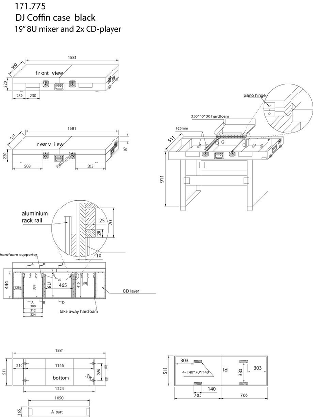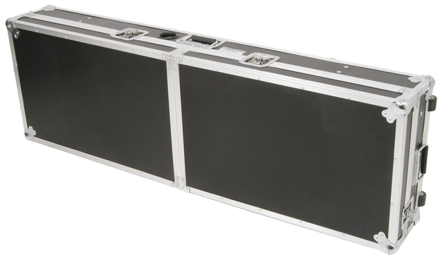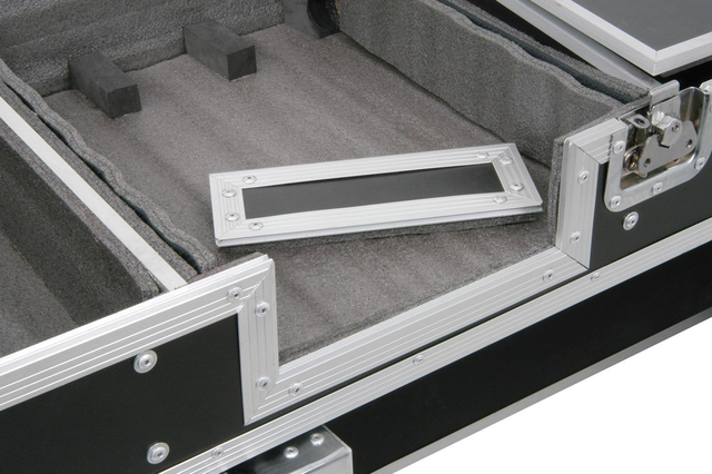 Flightcase 19" de gran solidez para una mesa de mezclas DJM de 8U, 2 lectores CD CDJ y espacio para guardar 80 discos CD. Equipado con un panel plegable con visagras para sujetar un portatil PC y ruedas.