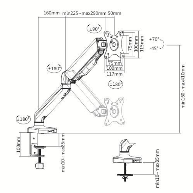 La serie MAD-G de brazos para monitor con amortiguador de gas son fuertes en apariencia y robustos en prestaciones. Con un solo dedo, el mecanismo de alta calidad de amortiguación por gas, permite mover el monitor, incluso arriba y abajo, extendiendo y retrayendo hasta encontrar la posición ergonómica idónea del monitor. El Soporte VESA permite un montaje y desmontaje rápido. La pinza para la mesa y accesorios están incluidos. El cable queda recogido en el brazo dando un área de trabajo muy limpia. VESA compatible con 75x 75 y 100x 100.