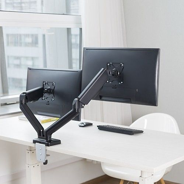 La serie MAD-G de brazos para monitor con amortiguador de gas son fuertes en apariencia y robustos en prestaciones. Con un solo dedo, el mecanismo de alta calidad de amortiguación por gas, permite mover el monitor, incluso arriba y abajo, extendiendo y retrayendo hasta encontrar la posición ergonómica idónea del monitor. El Soporte VESA permite un montaje y desmontaje rápido. La pinza para la mesa y accesorios están incluidos. El cable queda recogido en el brazo dando un área de trabajo muy limpia. VESA compatible con 75x 75 y 100x 100.