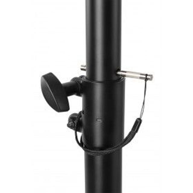 Este tripode metalico de gran resistencia es perfecto para altavoces PA hasta 80kg. Sus patas dan gran estabilidad y su sistema de ajuste de altura es muy seguro. La altura minima es de 136cm y la maxima es 200cm. El diametro es el estandar de 35mm.